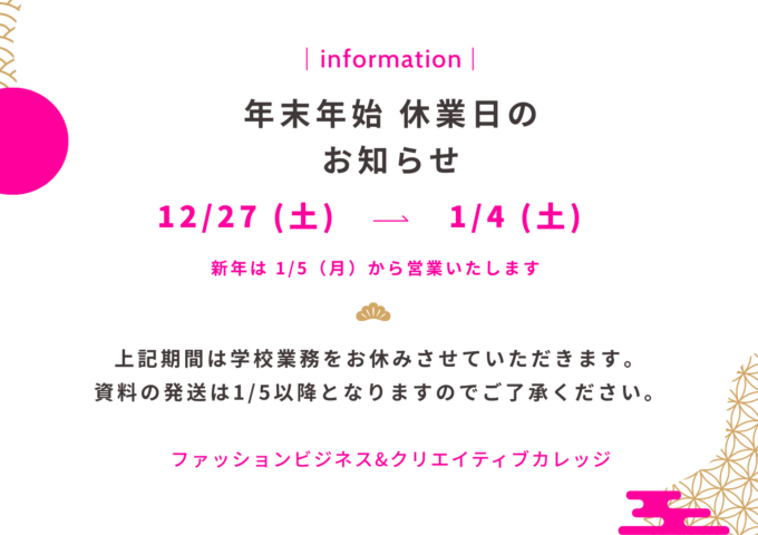 NEWS ニュース 2025.12.17年末年始 営業日のお知らせ2025.12.10特別講義 〜企画展「デザインの先生」を観に行きました!〜2025.11.25メイクアップ特別講義を行いました!2025.11.17ハロウィンピクニック2025を開催しました!2025.10.20避難訓練を実施しました2025.10.0110月1日(水)から指定校推薦入試の出願が始まりました!2025.09.02ファッション販売能力検定2級に合格しました!2025.09.01ファッション販売能力検定3級に合格しました!2025.08.199月1日からAO入試の出願が始まります! 1 2 3 … 5 »