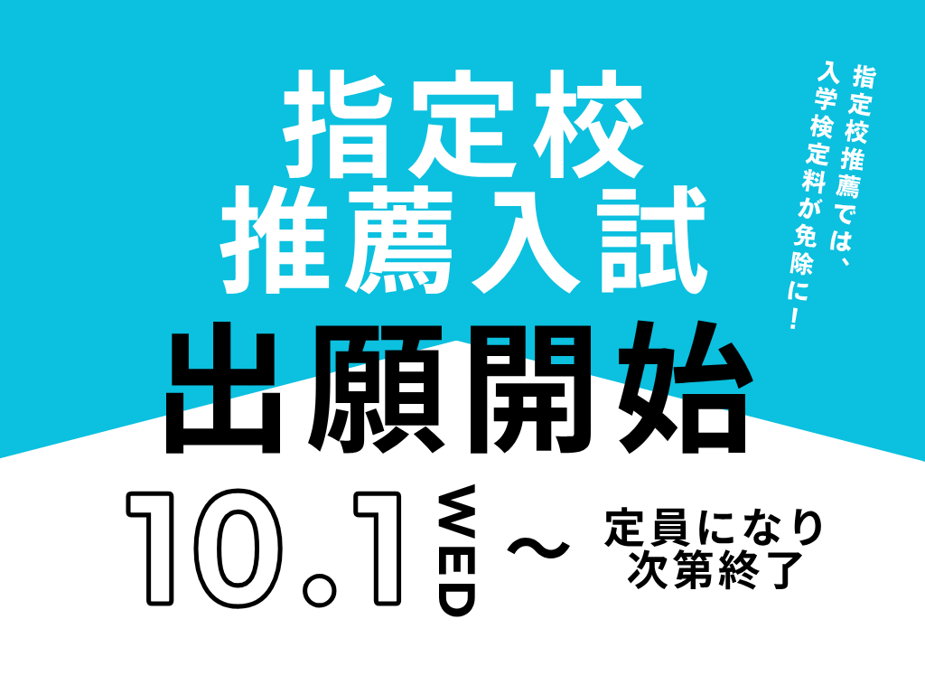 2025/10/01 10月1日(水)から指定校推薦入試の出願が始まりました! 10月1日より、指定校推薦入試の出願受付を開始いたします。 指定校推薦入試では入学検定料の4万円が免除となります。出願をご希望の方は、募集要項をご確認のうえ、必要書類をご準備ください。また、ご不明な点がございましたら、本校入試担当までお気軽にお問い合わせください。 みなさまの出願を心よりお待ちしております。